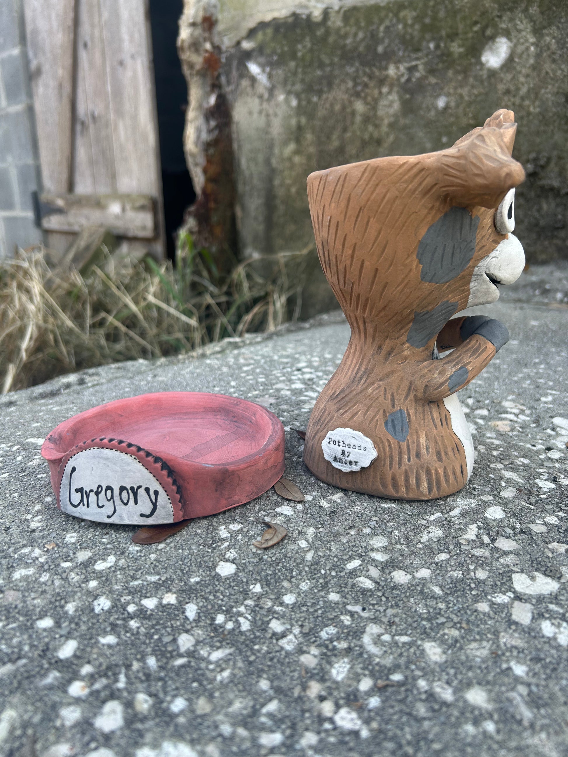 Gregory Goat is a ceramic pothead planter. He is hand-sculpted and hand-painted with a underglaze which is a paint like liquid colored clay. The surface is similar to a terra cotta planter. This helps keep it porous for the plant, and there is also a drainage hole. Included is a little drainage dish with name plate.