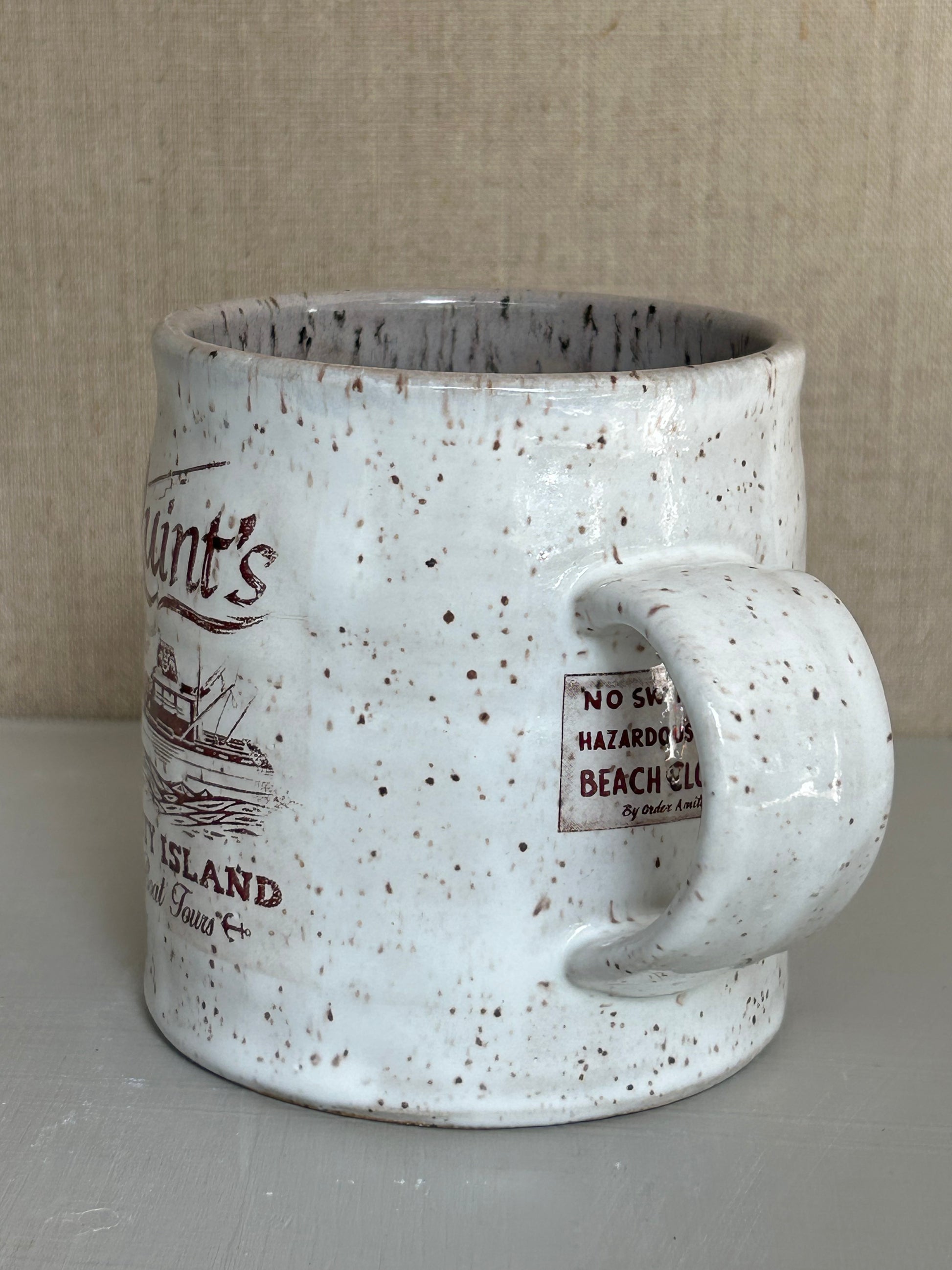 This mug is wheel thrown with buff speckled clay. White glaze and a third firing with decals images from the 1975 movie Jaws.