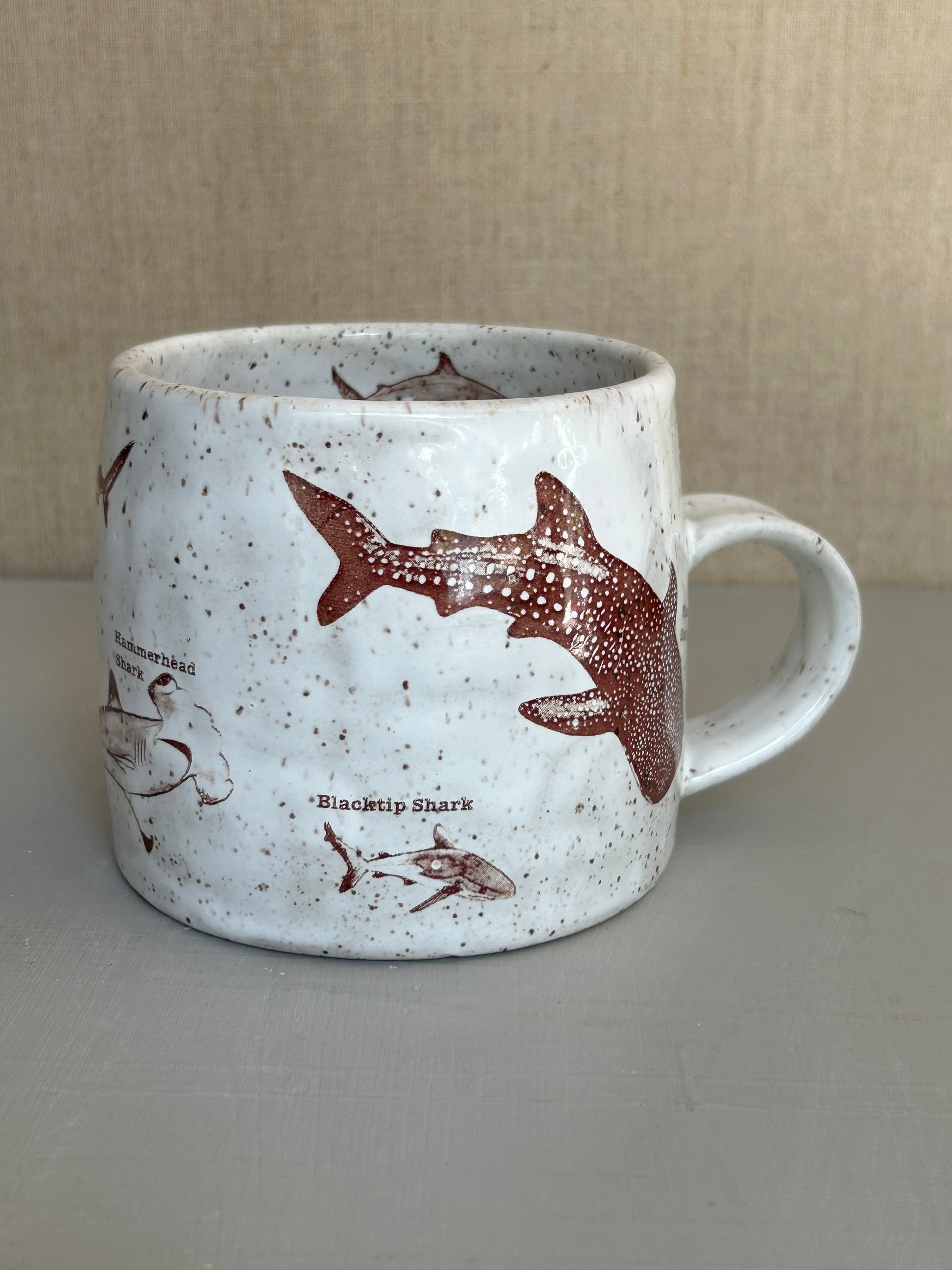 This mug is wheel thrown with buff speckled clay. White glaze and a third firing with decals images of different kinds of sharks.