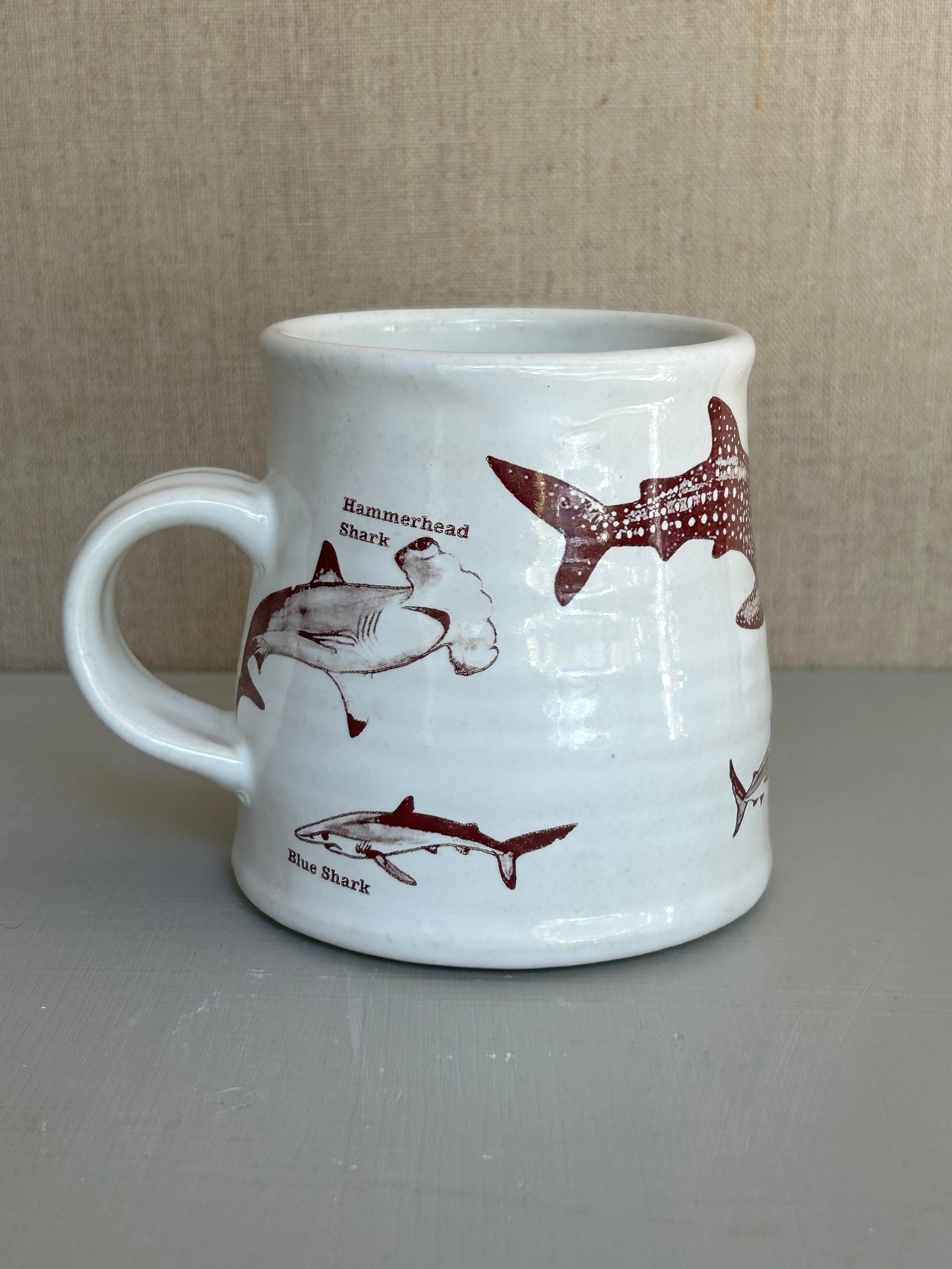 This mug is wheel thrown with white stoneware. White glaze and a third firing with decals images from the 1975 movie Jaws.